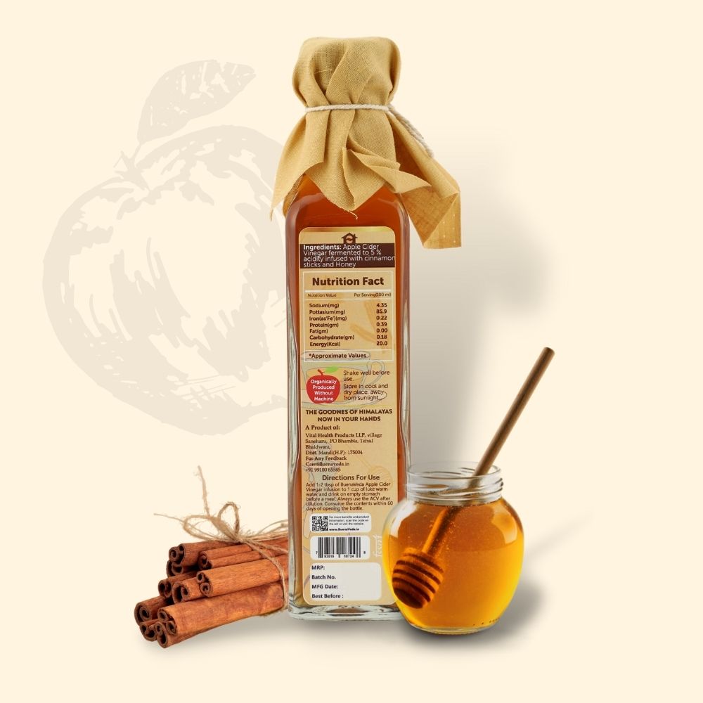 The ACV is unpasteurised, unfiltered and with an “Active Mother” that is very potent, and full of healthy enzymes. After the process of fermentation is complete, it is infused with Organic Cinnamon and Raw Honey for a period of 1-2 months.
